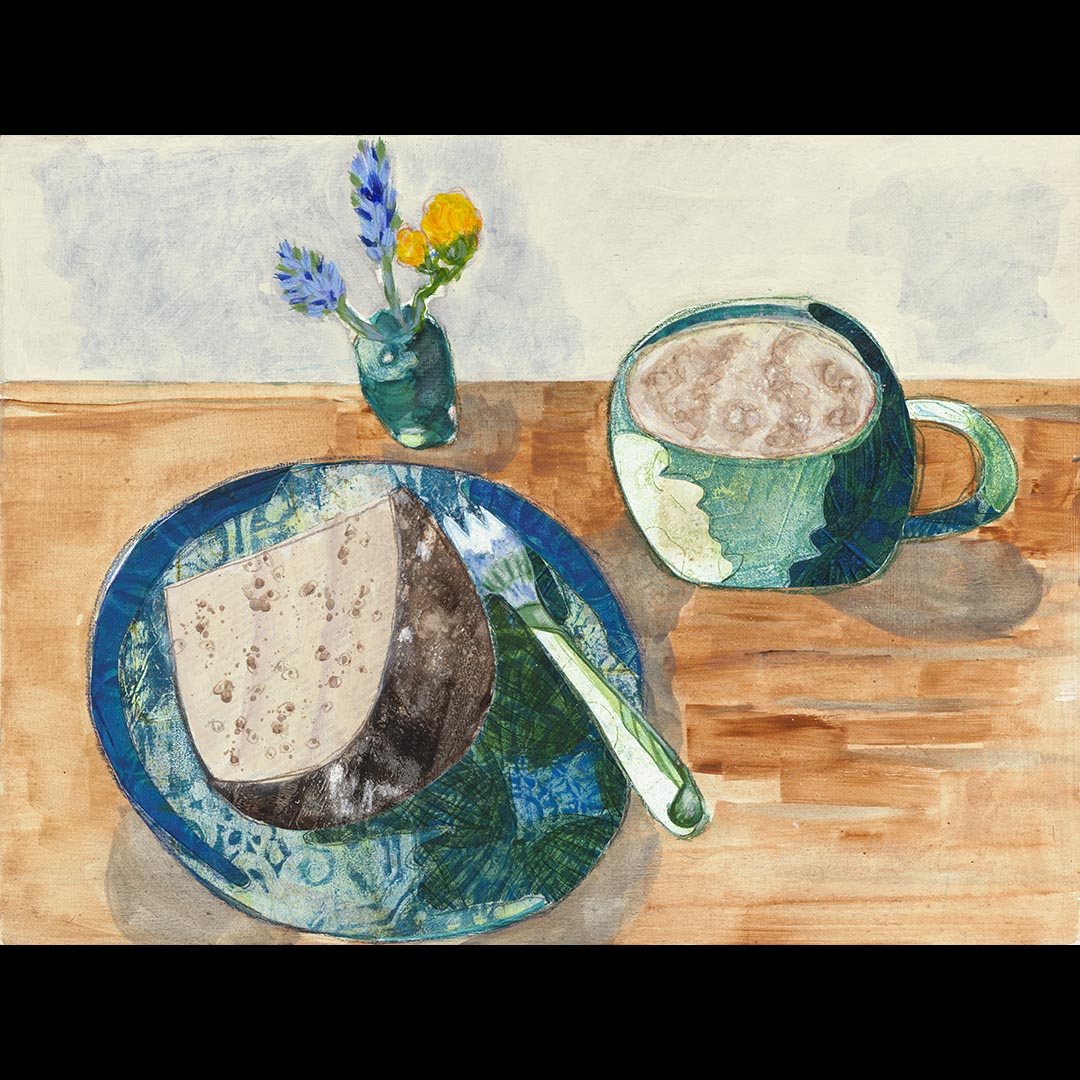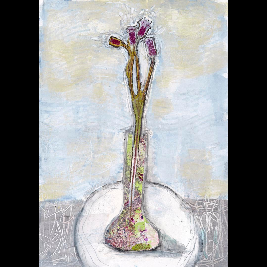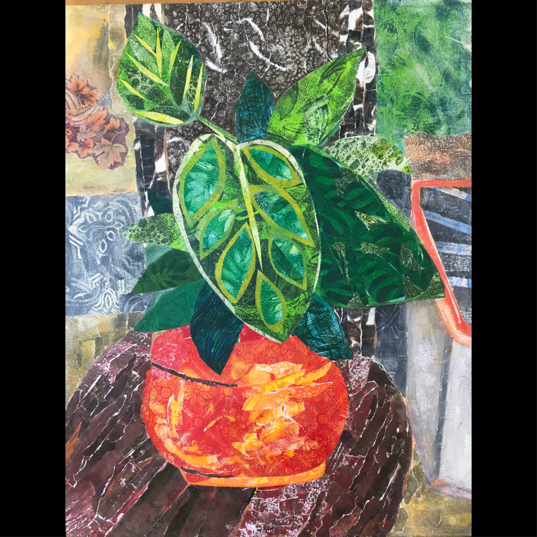 Painted paper collage, acrylic and pencil on board.