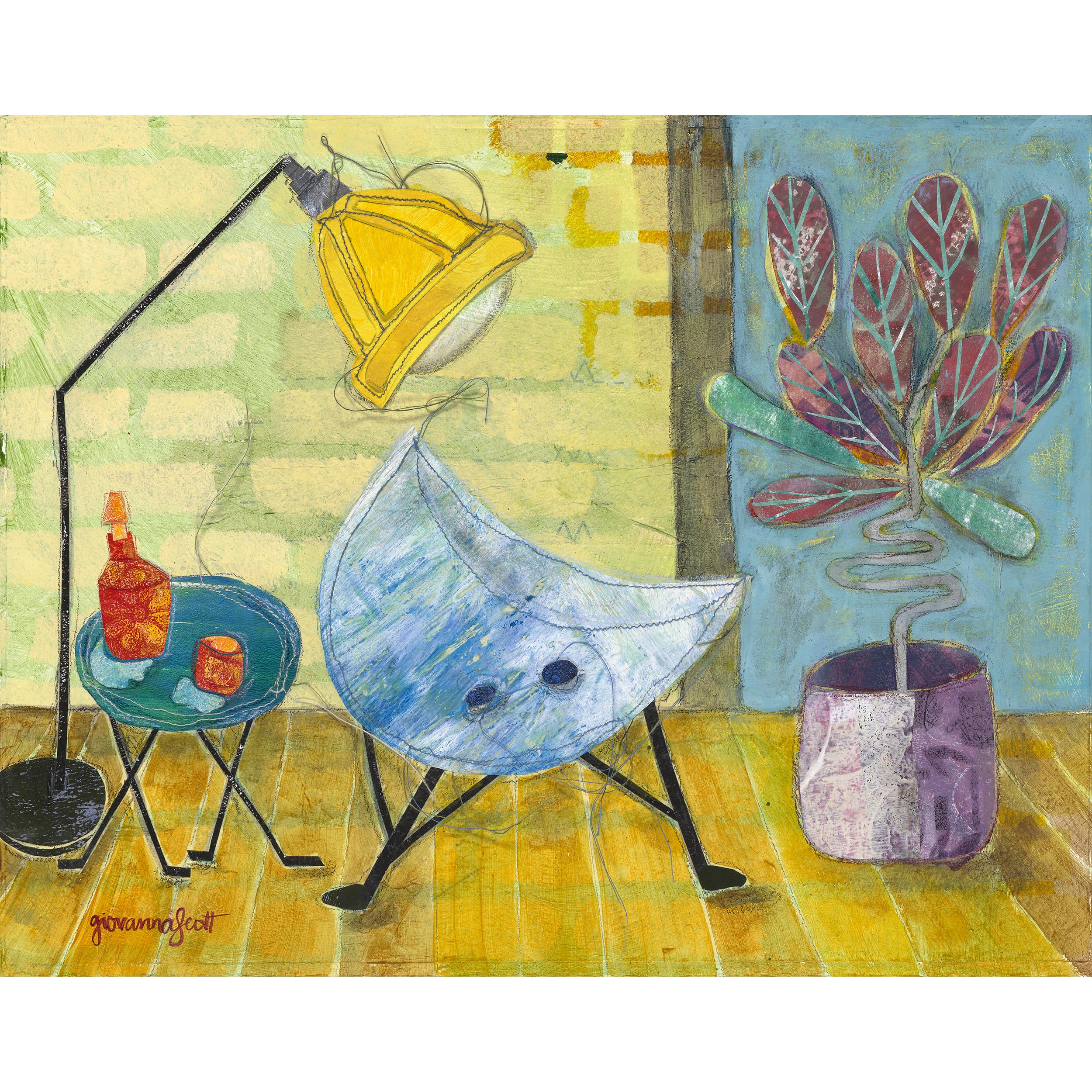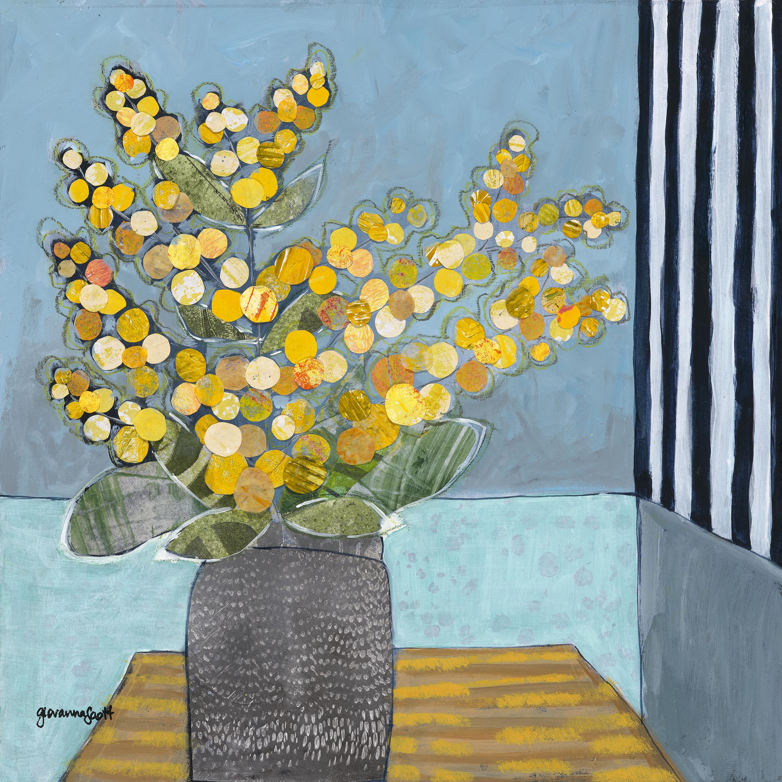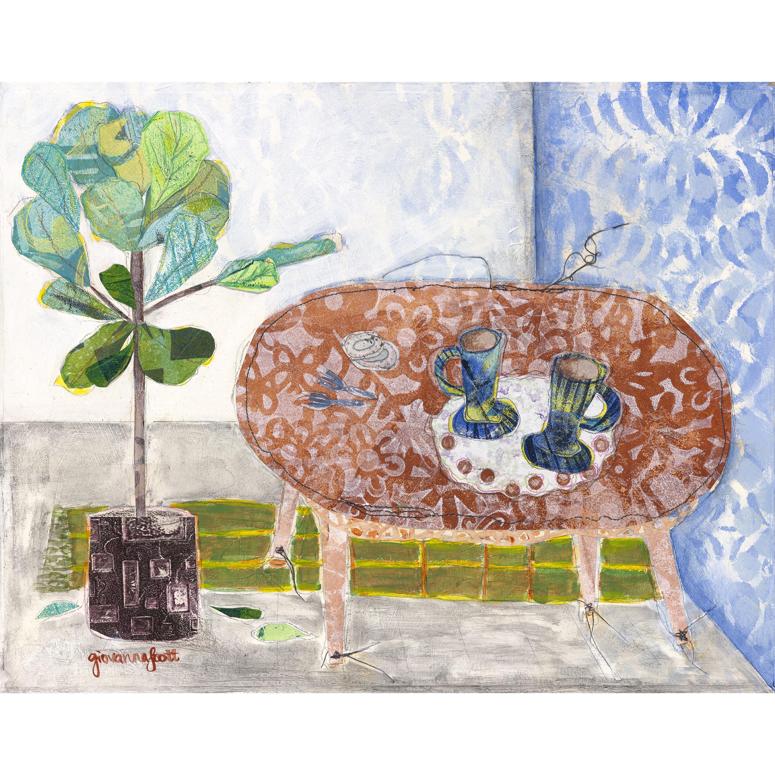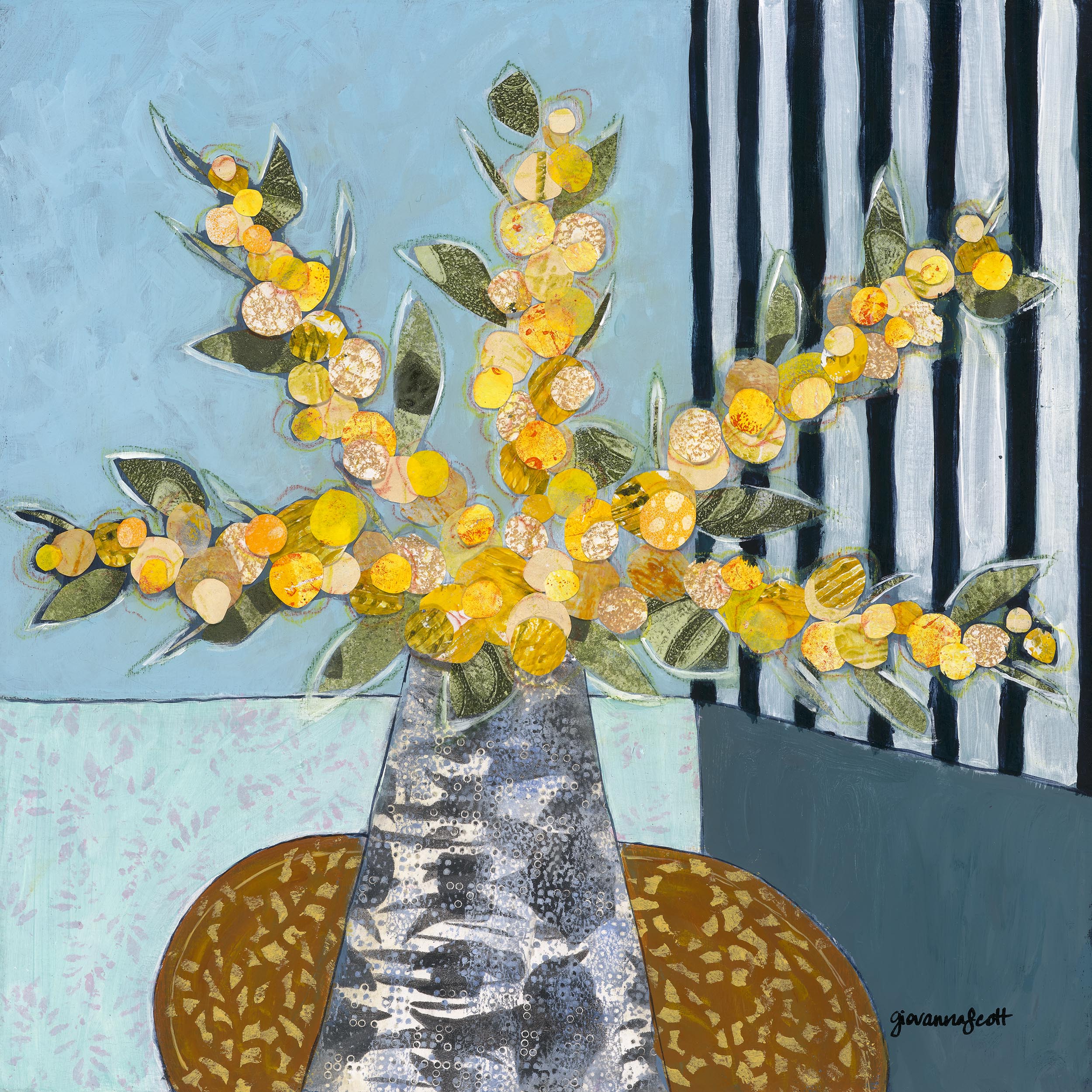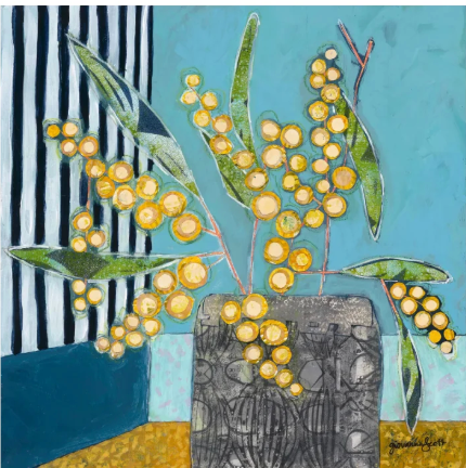 Painted paper collage, acrylic, machine stitching and pencil on canvas. 30x30cm SOLD