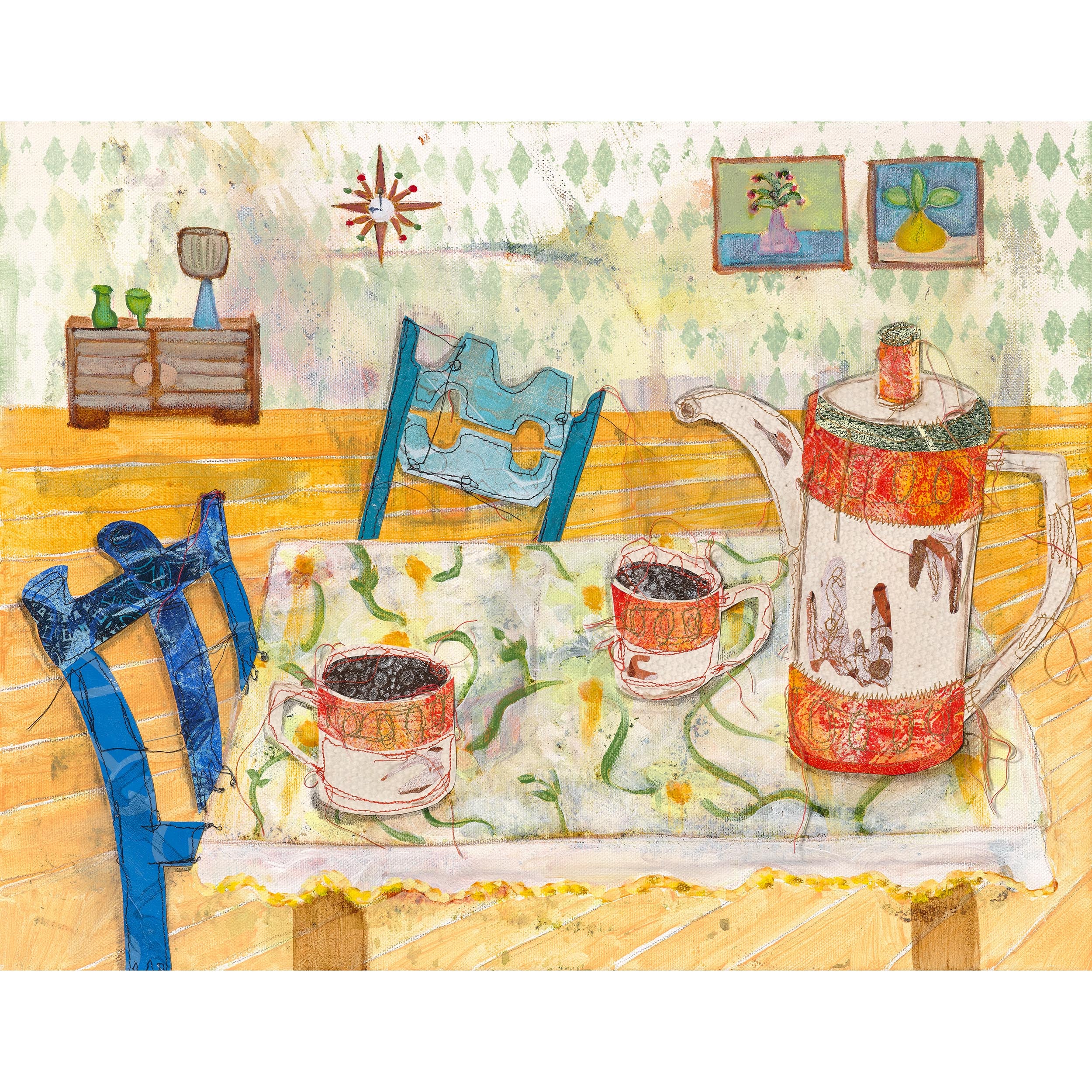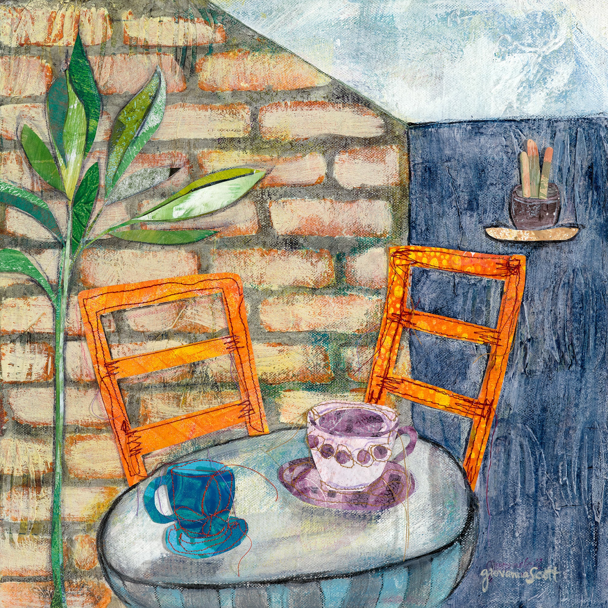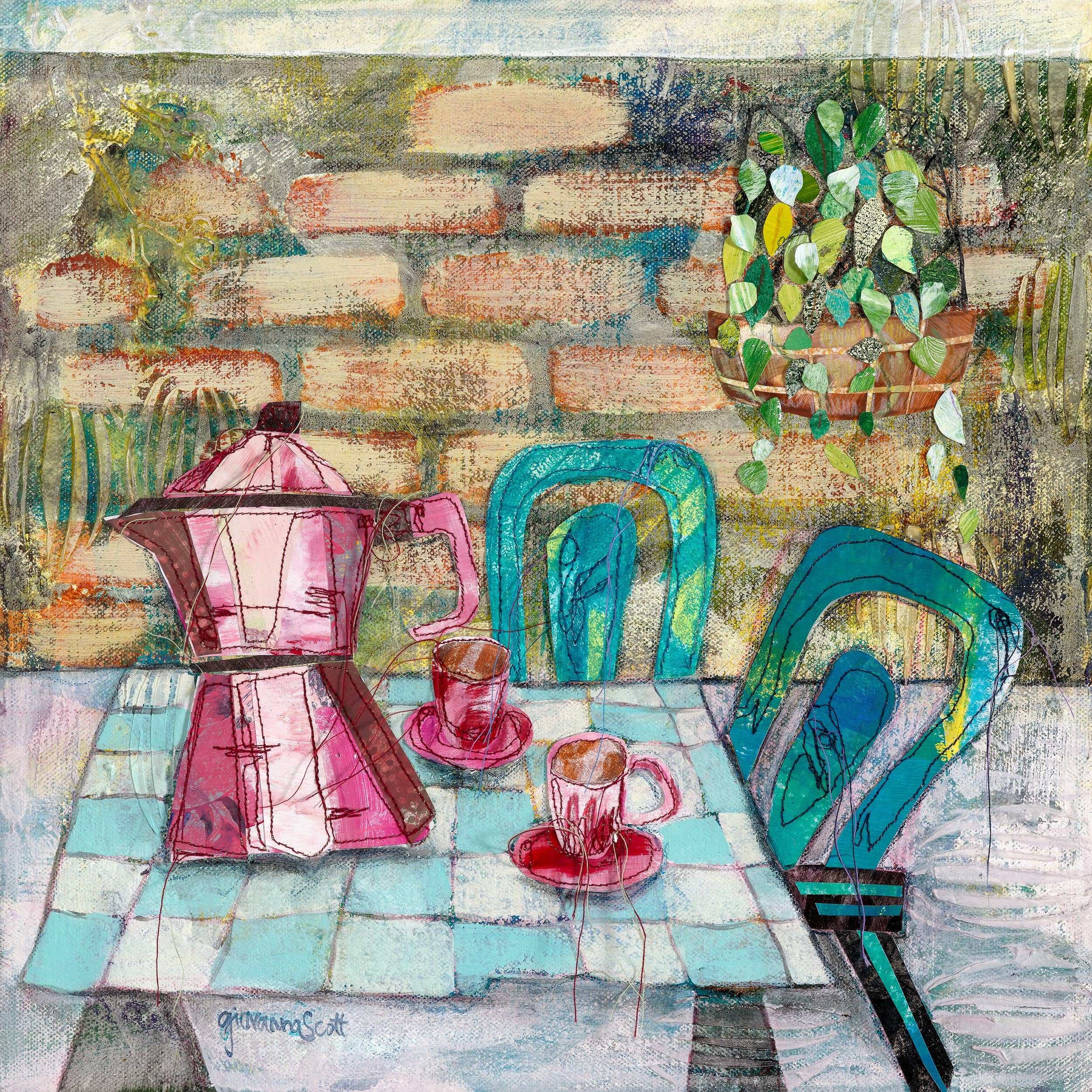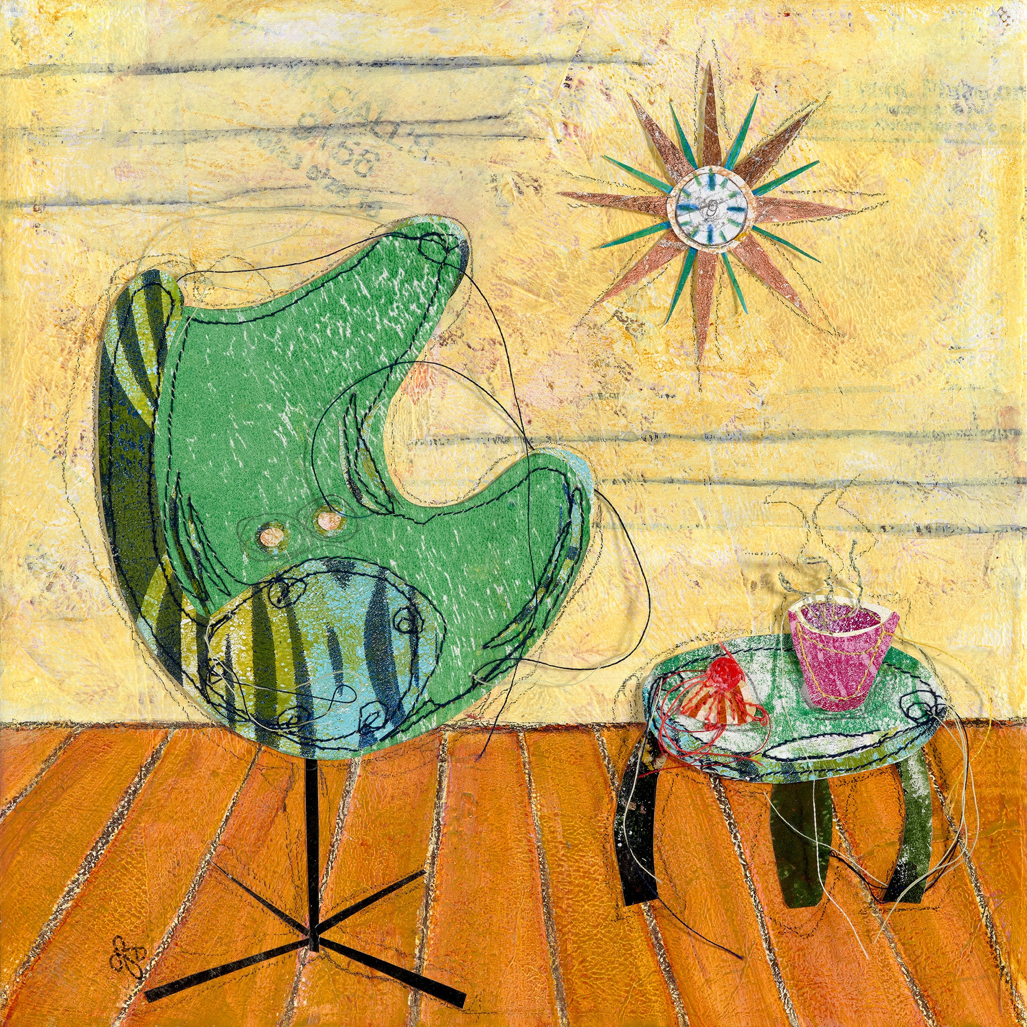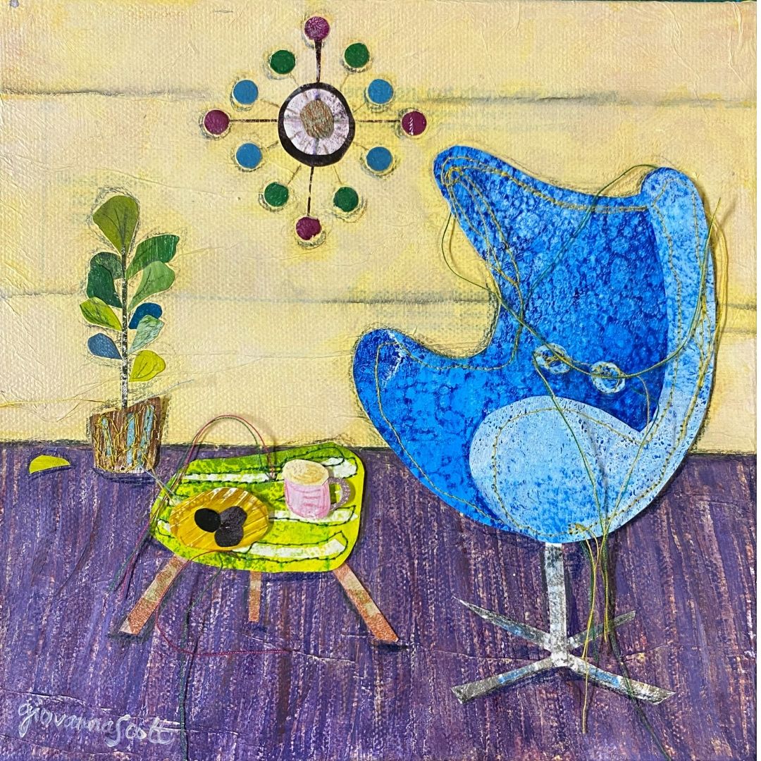 Painted paper collage, acrylic, machine stitching and pencil on canvas. 30x30cm SOLD