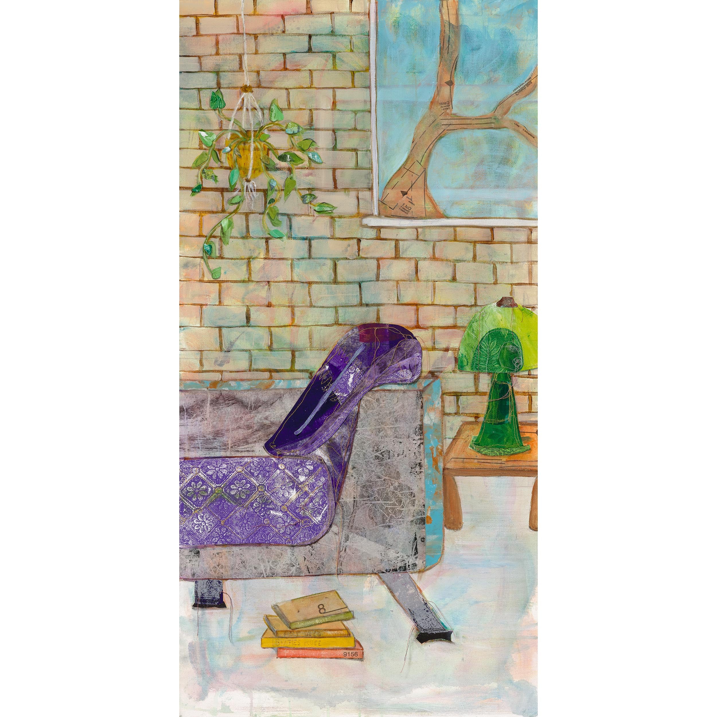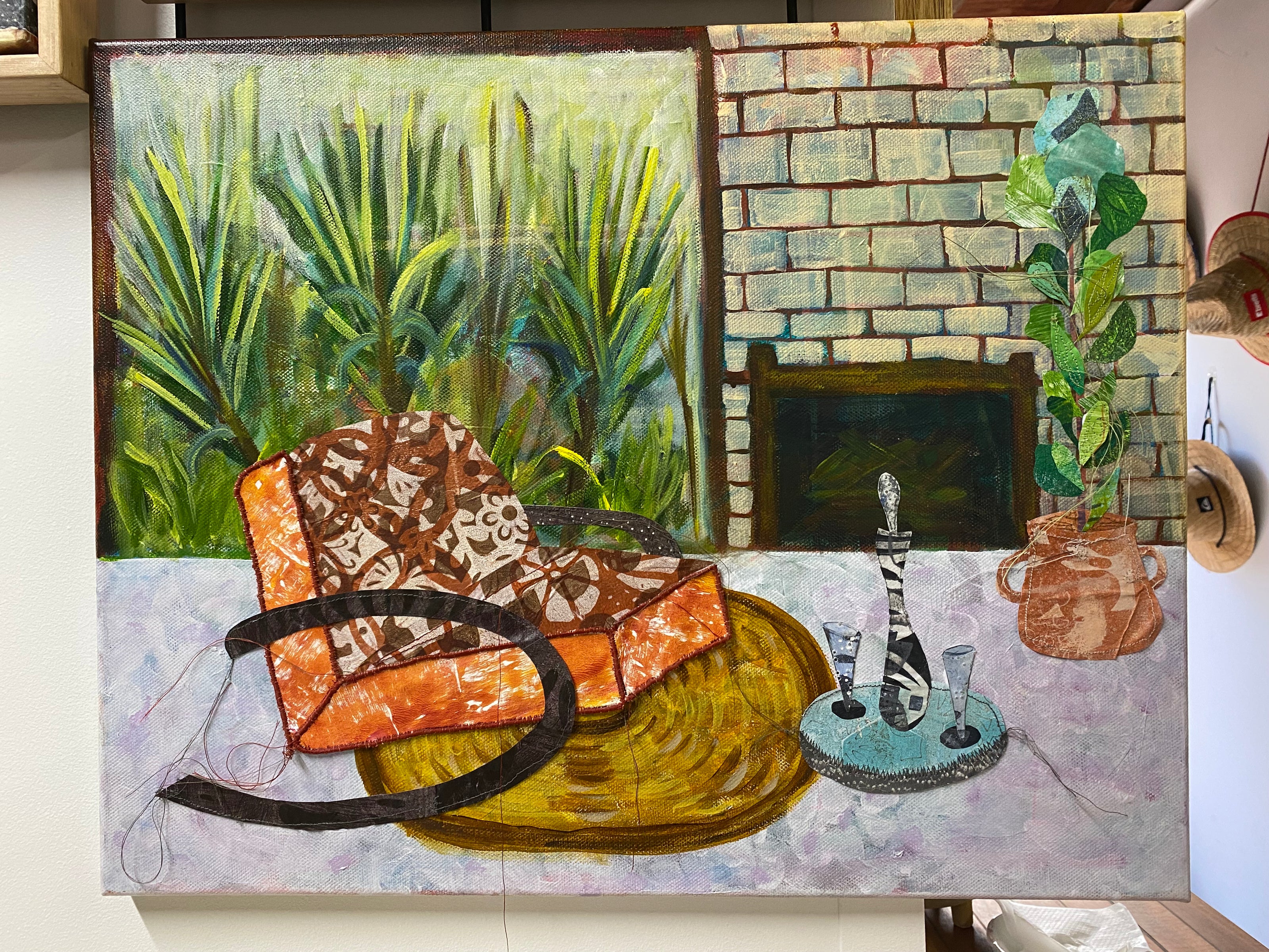 Painted paper collage, acrylic, machine stitching and pencil on canvas. 40x50cm