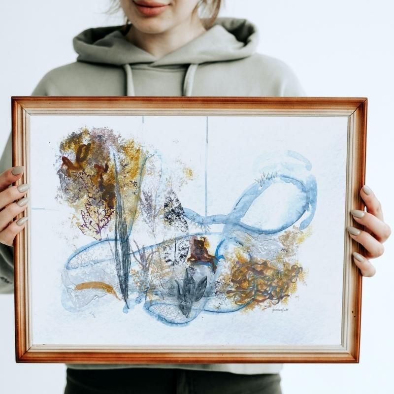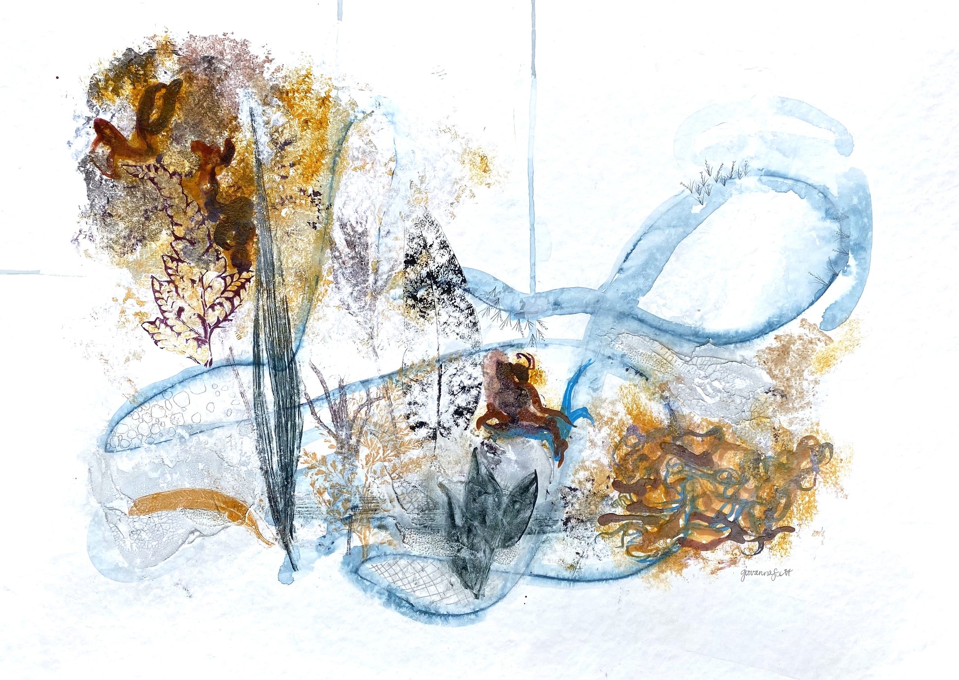 The native grasses that now line the banks of the creek with both creamy and lilacky flower stems are dotted along the blue creek line in all directions to highlight the chaos and devastation of the flood waters.