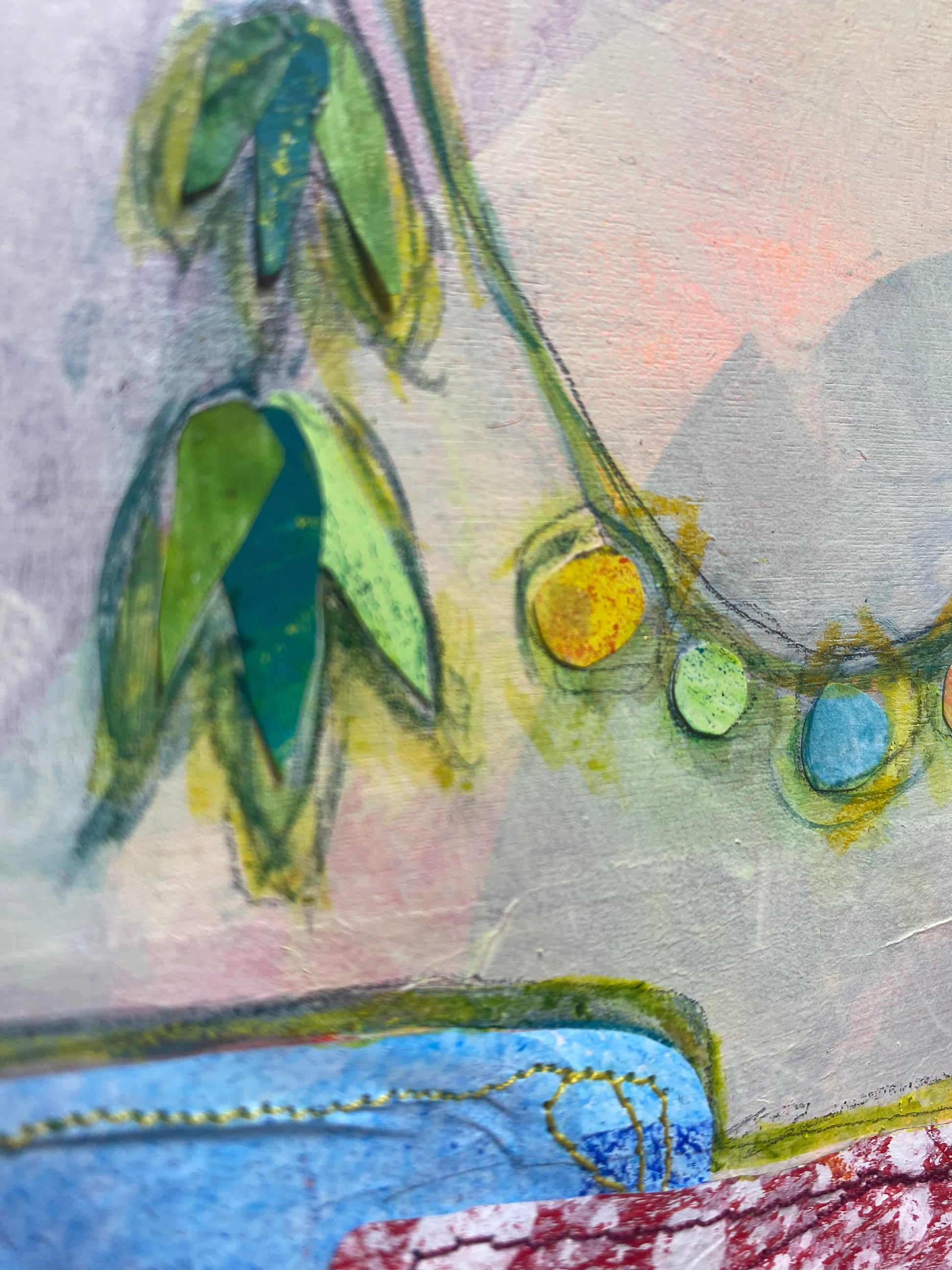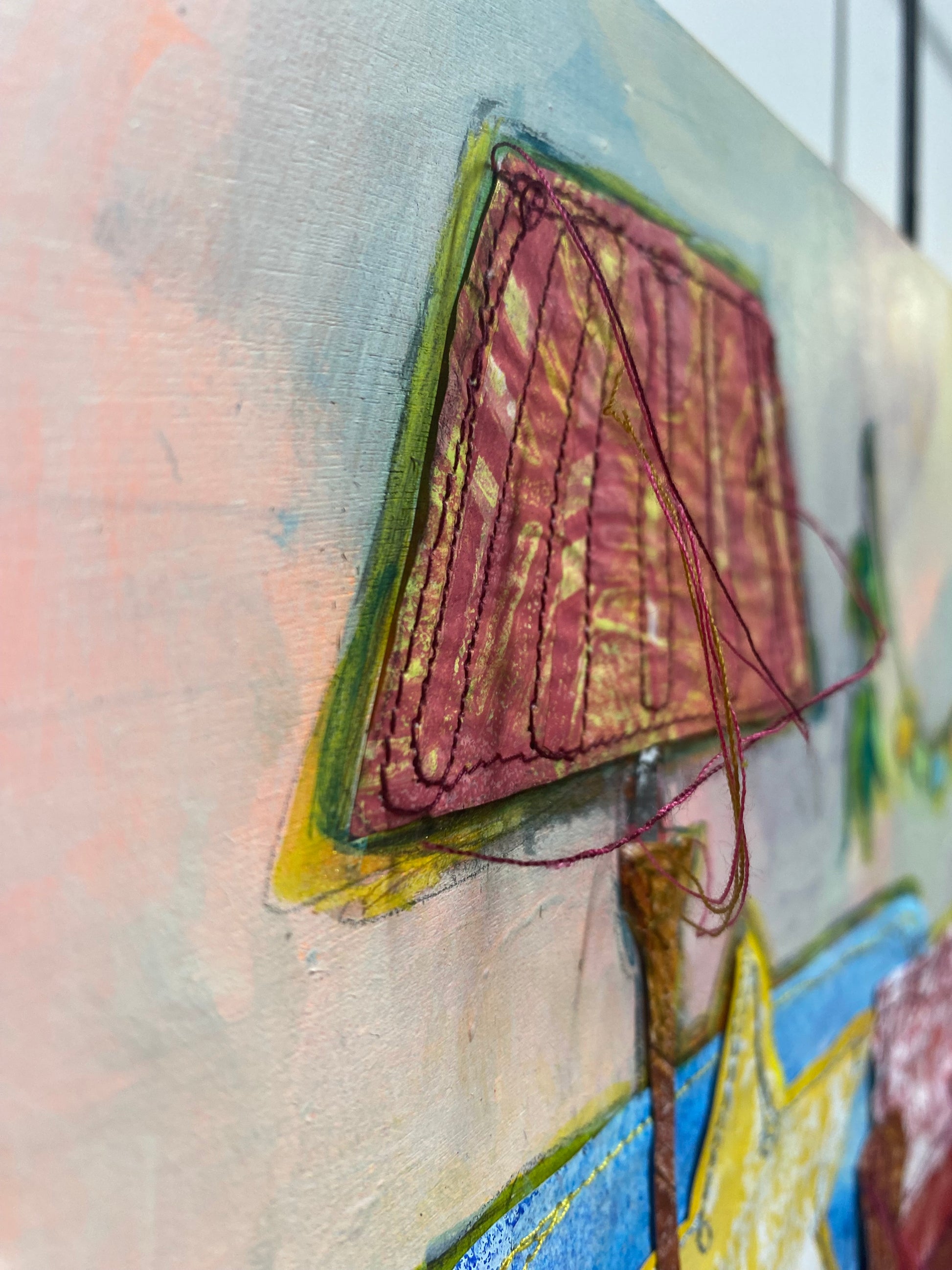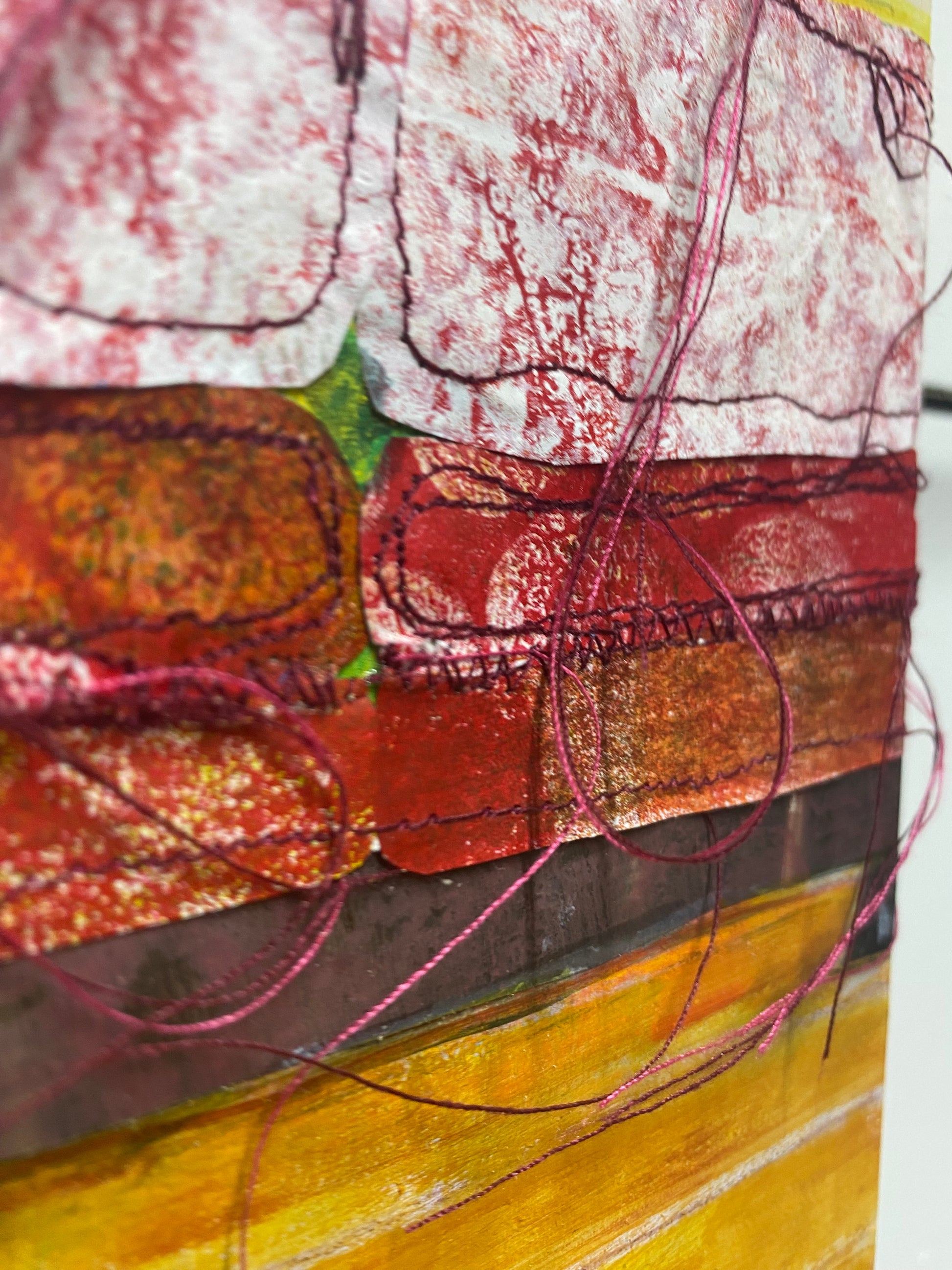 Painted paper collage, acrylic, machine stitching on board. (Custom frame made on request, just ask)