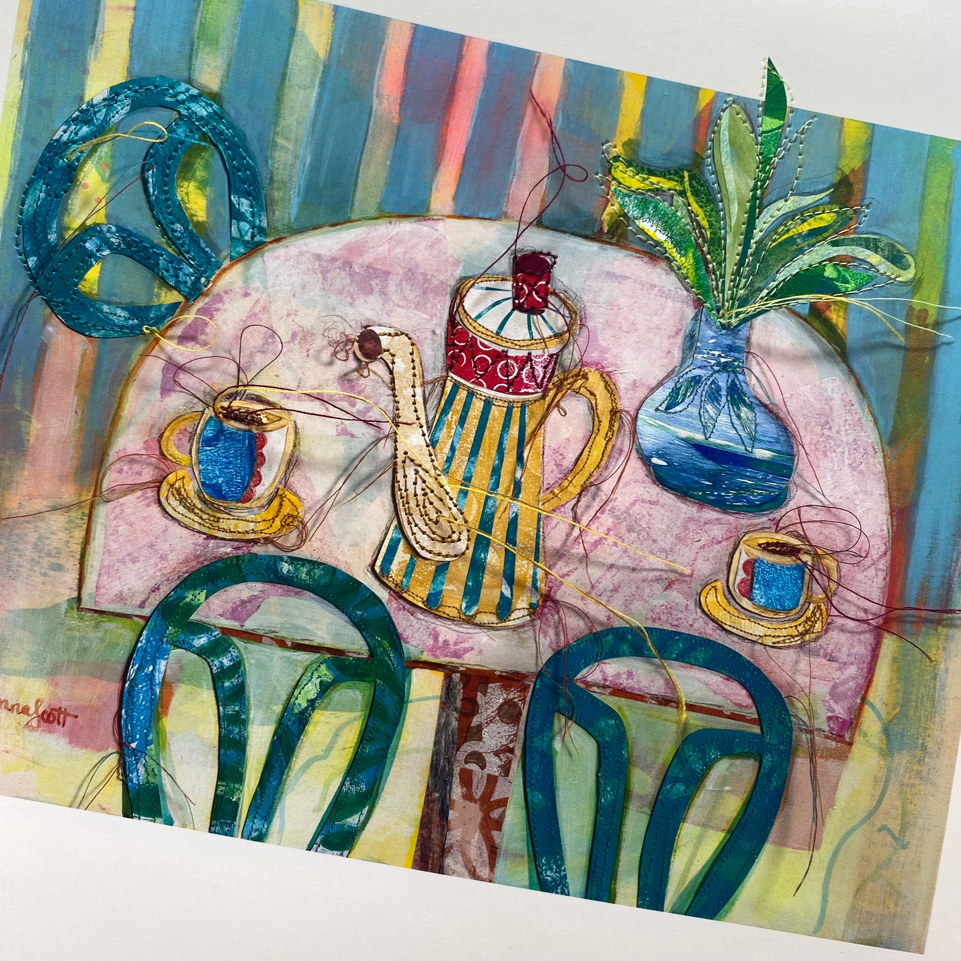 This piece begins as a fine art reproduction of my original painting “Retro Metro”, printed on archival paper. I then add new layers of collage and free-motion stitching, turning each one into a tactile, unique artwork. No two are ever the same.